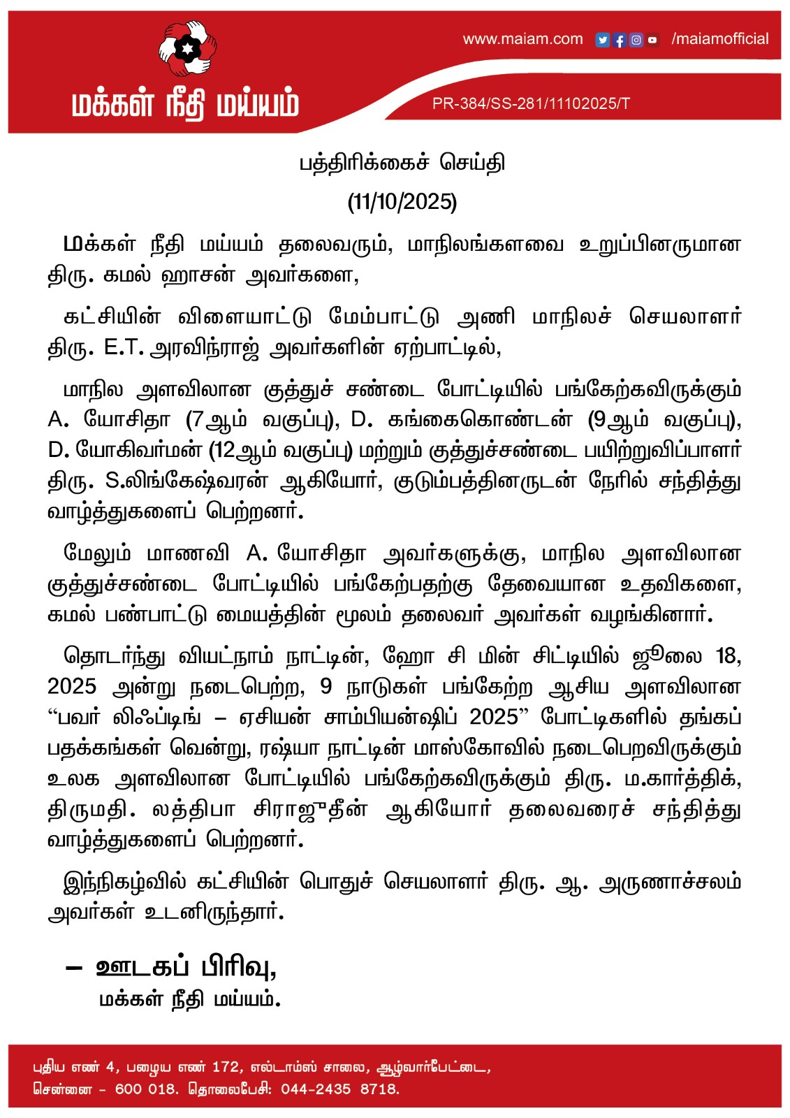 மக்கள் நீதி மய்யம் தலைவரும், மாநிலங்களவை உறுப்பினருமான திரு. கமல் ஹாசன் அவர்களை,