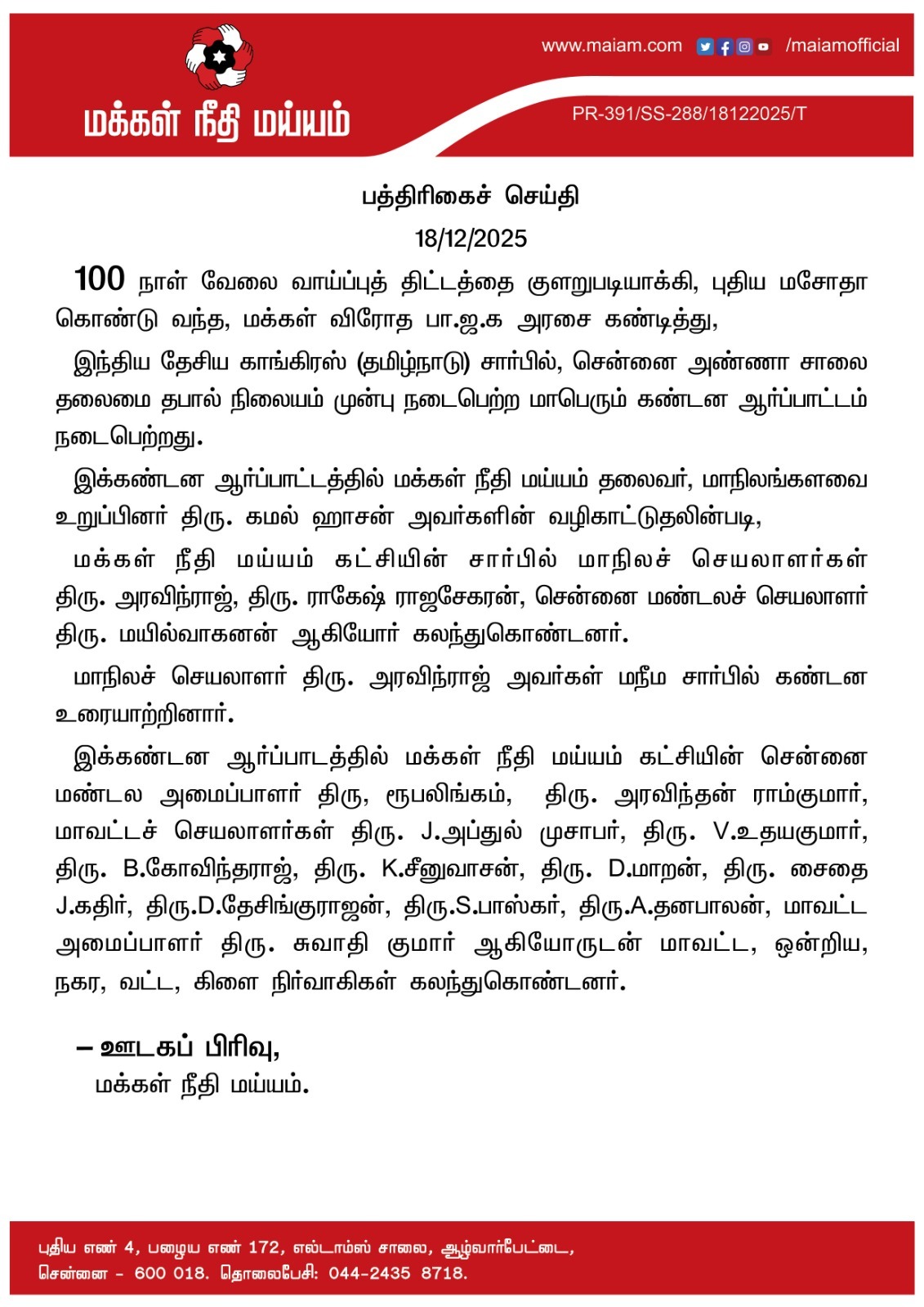 இக்கண்டன ஆர்ப்பாட்டத்தில் மக்கள் நீதி மய்யம் தலைவர், மாநிலங்களவை உறுப்பினர் திரு. கமல் ஹாசன் அவர்களின் வழிகாட்டுதலின்படி,