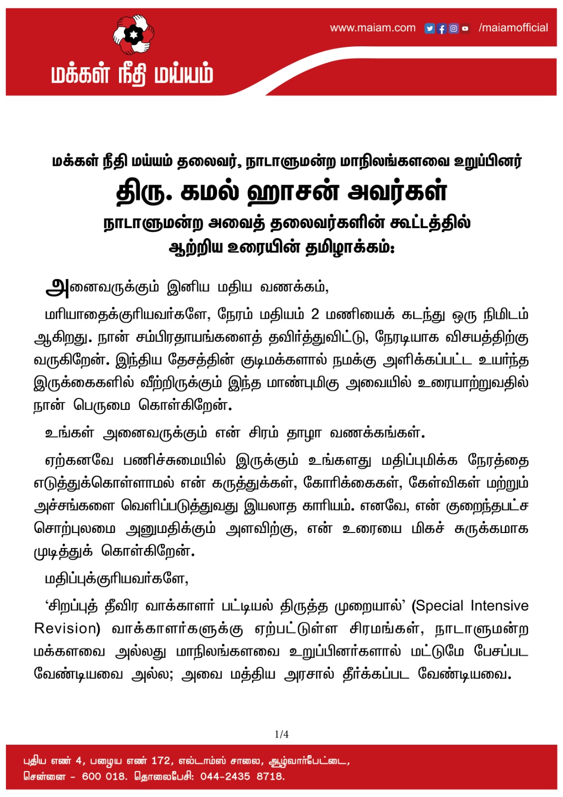 மக்கள் நீதி மய்யம் தலைவர், நாடாளுமன்ற மாநிலங்களவை உறுப்பினர் திரு. கமல் ஹாசன் அவர்கள் நாடாளுமன்ற அவைத் தலைவர்களின் கூட்டத்தில் ஆற்றிய உரையின் தமிழாக்கம்: