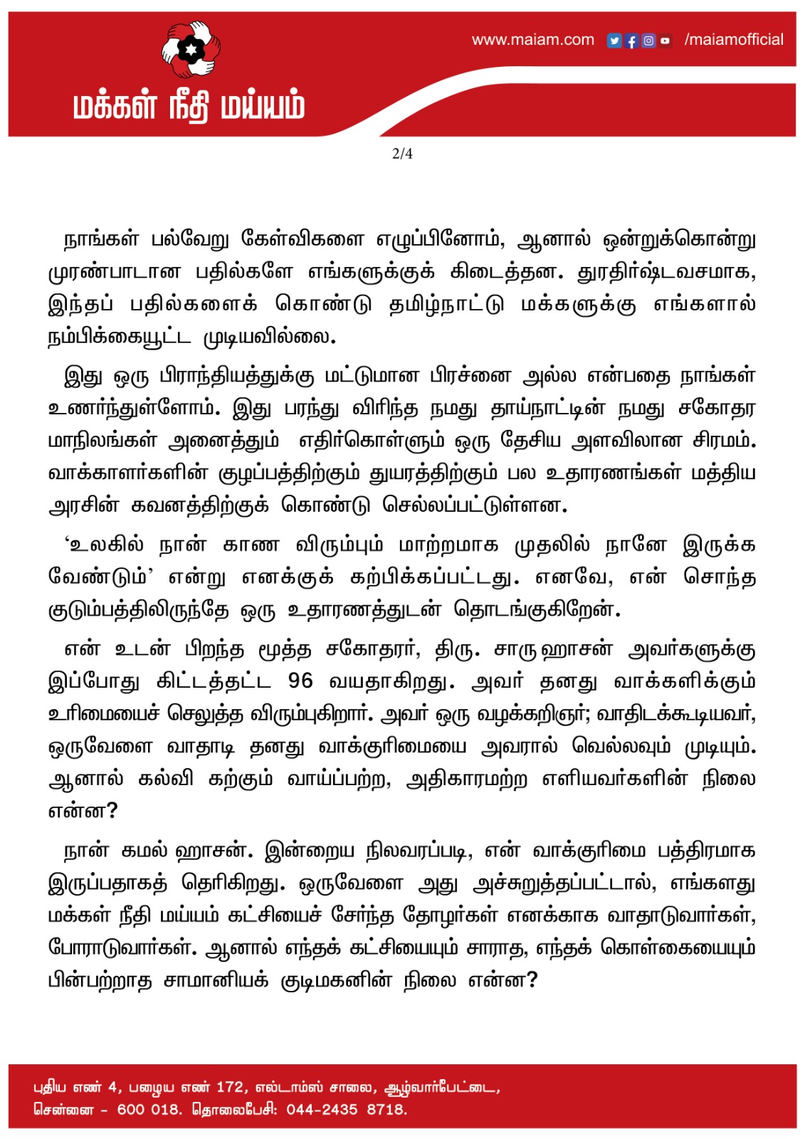 என் உடன் பிறந்த மூத்த சகோதரர், திரு. சாருஹாசன் அவர்களுக்கு இப்போது கிட்டத்தட்ட 96 வயதாகிறது. அவர் தனது வாக்களிக்கும் உரிமையைச் செலுத்த விரும்புகிறார். அவர் ஒரு வழக்கறிஞர்; வாதிடக்கூடியவர், ஒருவேளை வாதாடி தனது வாக்குரிமையை அவரால் வெல்லவும் முடியும். ஆனால் கல்வி கற்கும் வாய்ப்பற்ற, அதிகாரமற்ற எளியவர்களின் நிலை என்ன?