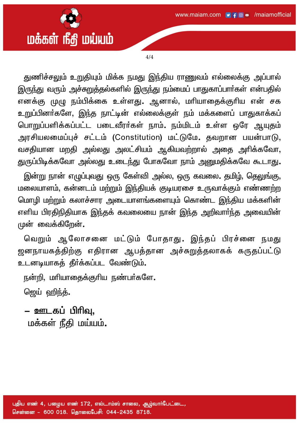 இன்று நான் எழுப்புவது ஒரு கேள்வி அல்ல, ஒரு கவலை. தமிழ், தெலுங்கு, மலையாளம், கன்னடம் மற்றும் இந்தியக் குடியரசை உருவாக்கும் எண்ணற்ற மொழி மற்றும் கலாச்சார அடையாளங்களையும் கொண்ட இந்திய மக்களின் எளிய பிரதிநிதியாக இந்தக் கவலையை நான் இந்த அறிவார்ந்த அவையின் முன் வைக்கிறேன்.
